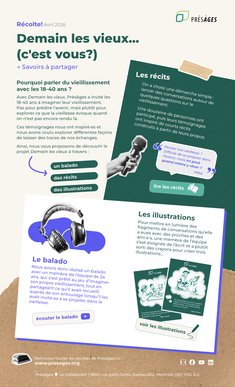 Présâges est depuis longtemps en dialogue avec les aîné·e·s, avec les milieux qui les accompagnent, ainsi qu'avec des acteurs et actrices de l'innovation sociale. Ces échanges rassemblent des personnes de tous âges et cette mixité nourrit nos réflexions. Être à l'écoute des réalités et des aspirations des aîné·e·s, tout en croisant ces perspectives avec celles de personnes engagées dans des initiatives de transformation sociale, ça fait partie de l’ADN de Présâges.